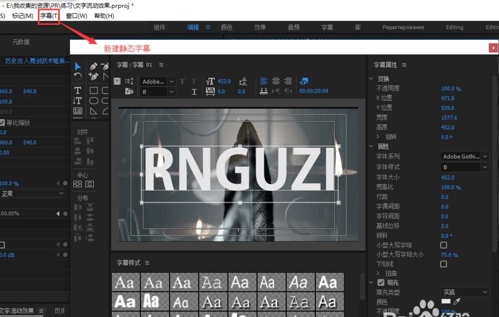 4、选择字幕菜单,选择新建字幕,选择静态字幕,在弹出的字幕编辑窗口中输入字幕文字,我这里输入的“RNGUZI”,别问为什么,因为狗年的小狗够强,然后调整文字的大小字体和位置到合适即可。