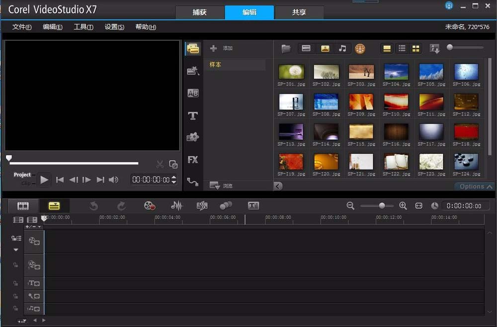 1、首先打开会声会影软件,任意版本都是可以的,这里用的是x7的版本,打开后进入到软件的主界面,下边就是视频轨的面板。