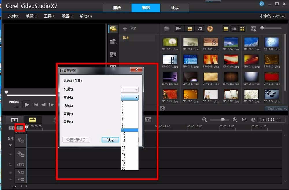 2、在视频轨的左上角有个加减号的图标,点击打开,就会弹出视频轨道管理器的窗口,这里点击覆叠轨,添加9个覆叠轨。
