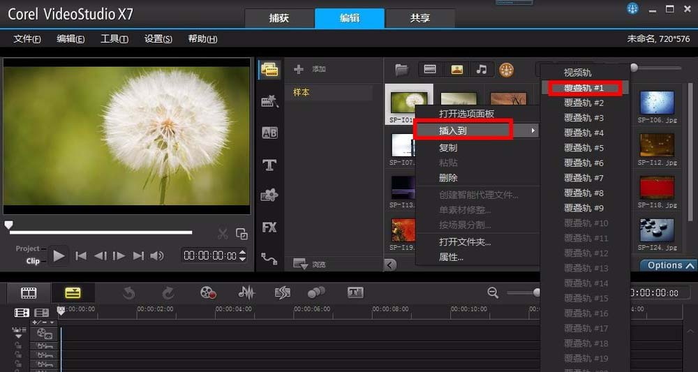 4、接下来就要这9个覆叠轨里添加素材了,当然视频和图片都是可以的,这里先添加一些图片做为例子,点击素材库里的图片,右击选择插入到,然后选择要插入的覆叠轨编号,每个覆叠轨里插入一张图片,总共插入9张图片。