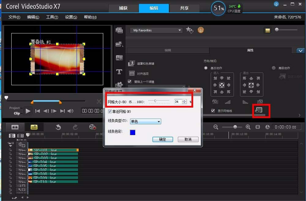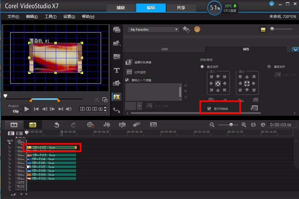 5、接着点击第一个覆叠轨的图片素材,然后在右上的区域会显示设置素材的一些参数,其中有一个显示网格线的选项,将其前面打上勾,同时在视频预览窗口就会显示网格线。