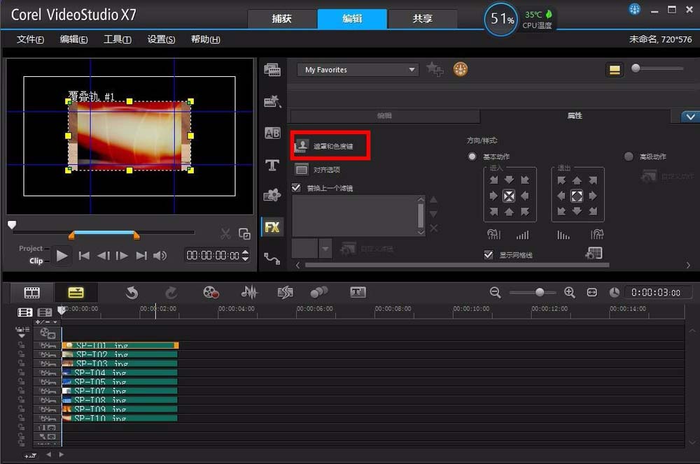 7、接着同样点击覆叠轨1的素材,然后点击右上窗口中的遮罩和色度键选项,如图所示: