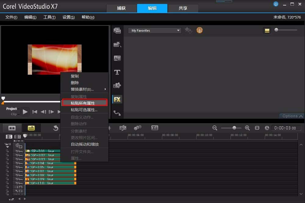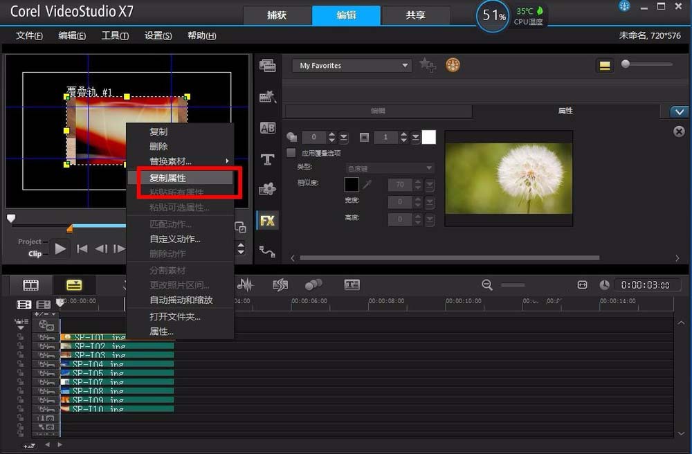 9、设置好之后,右击覆叠轨1的素材,在右键菜单中选择复制属性,然后选中剩余的8个覆叠轨素材,同样右击鼠标,在右键菜单中选择粘贴所有属性,这样9个素材就都加上了一样的边框。