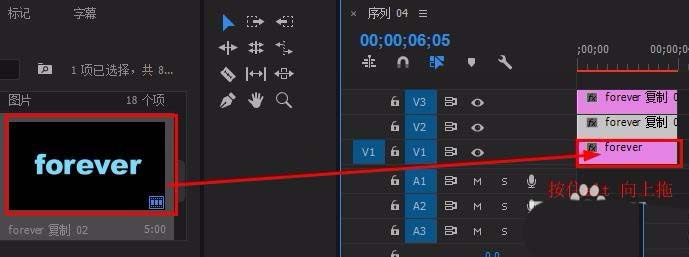 3、将字幕拖到v1轨道中,按住alt键向上拖拽至v2,同理拖到v3轨道,复制两个 (如图)