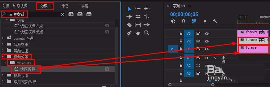 4、找到“效果面板”,在搜索栏输入“快速模糊”, (“效果”-“视频效果”-“obsolete”-“快速模糊”), 将它拖到v1和v2轨道视频上