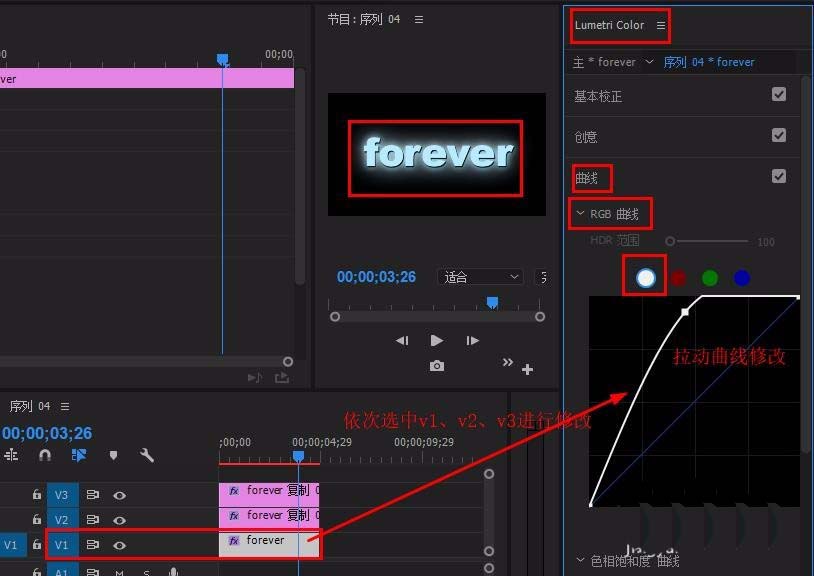 6、菜单栏中点击“窗口”-“Lumetri Color”(勾选),选中v1视频, 在弹出窗口中找到“曲线”,选择“白色图标”,拉动曲线修改(如图),同理依次选中v2和v3视频,修改(将文字提亮),曲线可根据自己想要的文字效果进行拉动