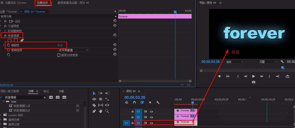 5、选中v1视频,找到“效果控件”-“快速模糊”,将v1“模糊度”调大(让文字的光发散出来),选中v2视频,找到“效果控件”-“快速模糊”,将v2“模糊度”调大一点即可(有内光源的感觉6、)