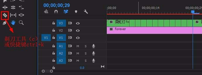 8、将原文字素材拖拽至v1轨道,嵌套素材放v2轨道,将轨道放大到每帧可见(缩放工具(z),按住alt键缩小),将嵌套视频剪切开(向右键移动标尺,ctrl+k剪切)(如图)