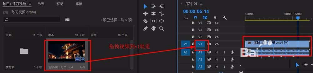 1、打开pr软件,在“项目面板”空白处双击导入一段视频素材;将视频拖入v1轨道中