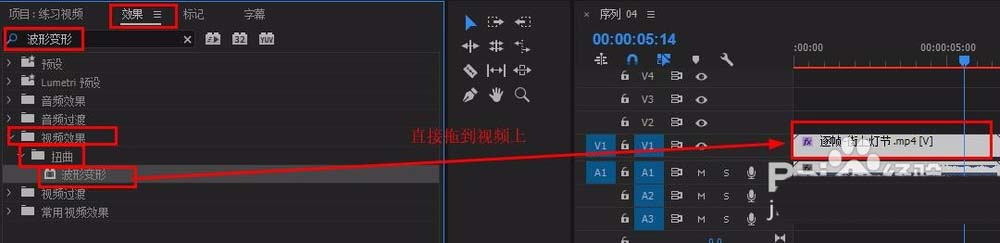2、在“效果”面板搜索栏输入“波形变形”,将它拖入视频中。(“效果”-“视频效果”-“扭曲”-“波形变形”)