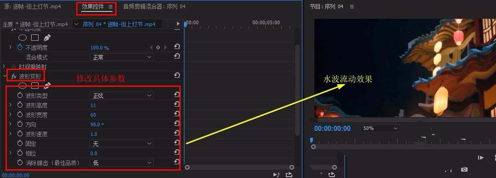 3、在“效果控件”面板中找到“波形变形”,修改其具体参数,调整波纹的大小及流动速度等,完成波形效果