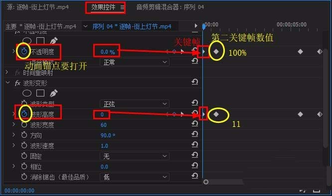 开始处,“不透明度 0”“波形变形 高度 0”,移动几秒后,“不透明度 100%”“波形变形 高度 11(自行决定)”,结尾前几秒处,“不透明度 100%”“波形变形 高度 11(自行决定)”,移动几秒(即结尾处),“不透明度 0”“波形变形 高度 0”