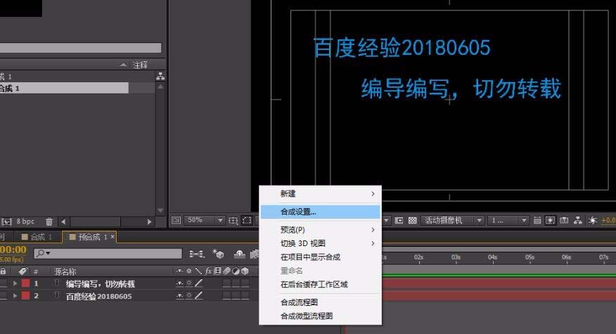 5、在空白处点击右键,点击打开-合成设置