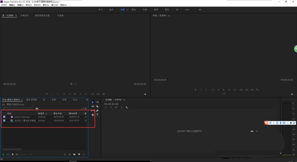 1、双击PR快捷图标,打开PR软件,新建一个项目,然后倒入两个不同的视频媒体文件到PR中。