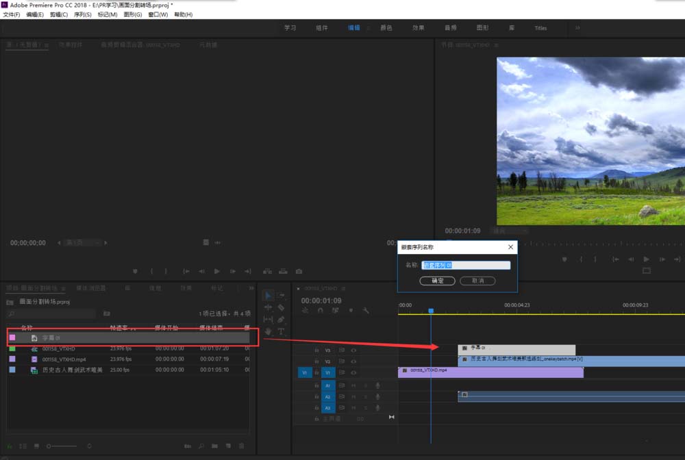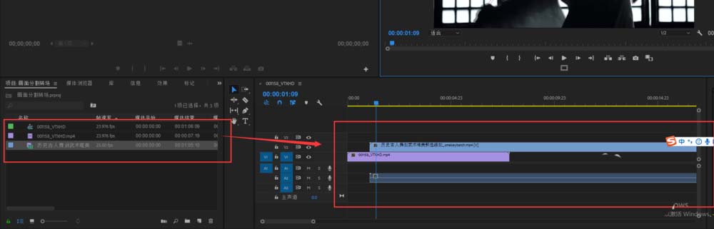 2、创建一个序列,将两个视频媒体文件移动到序列的时间轴中,分别放在视频轨道1和视频轨道2上。调整好他们的位置。