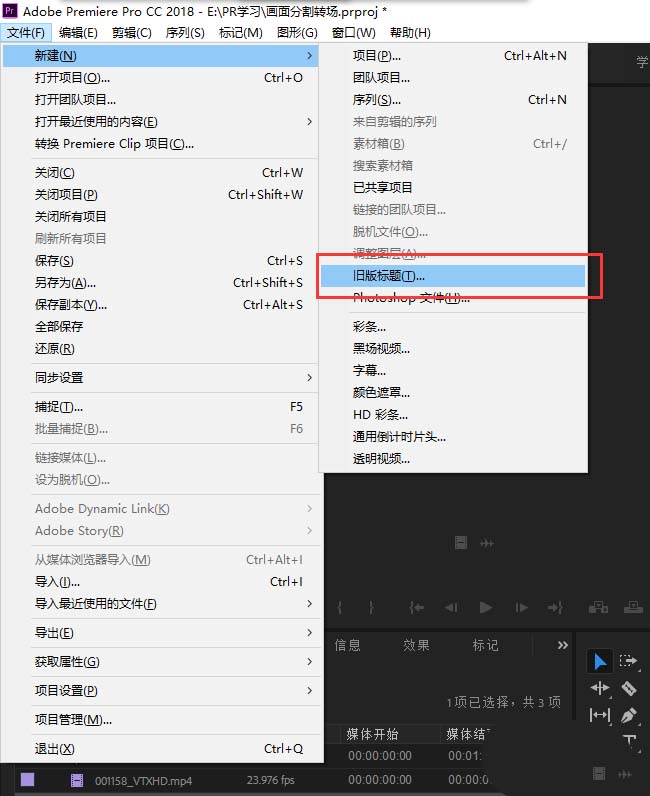 3、选择菜单栏中的文件菜单,选择新建命名,新建一个旧版标题,创建一个字幕。