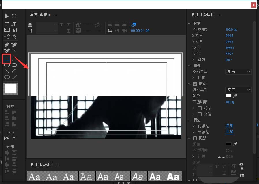 4、在弹出的字幕设置窗口中,选择工具中的矩形工具,在视频上半部分画出一个画面一半大小的矩形,设置矩形填充颜色为白色。