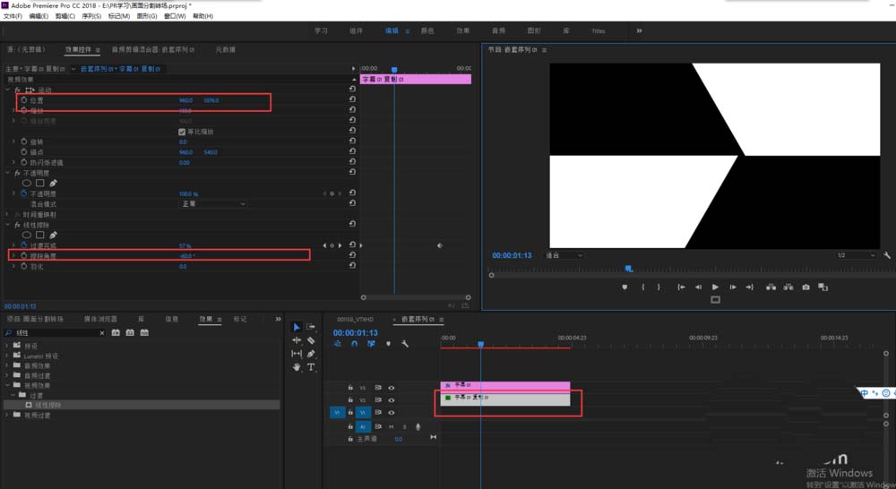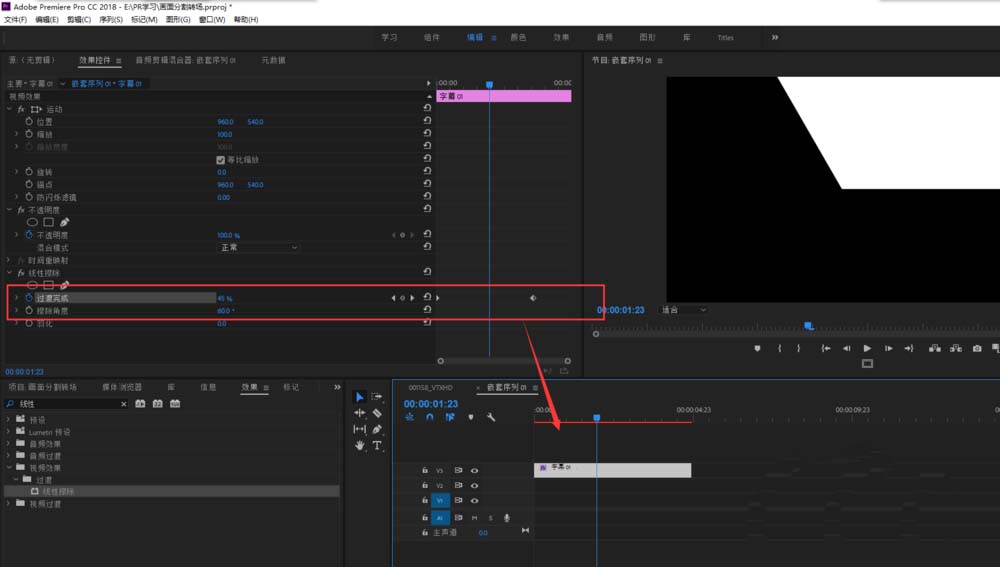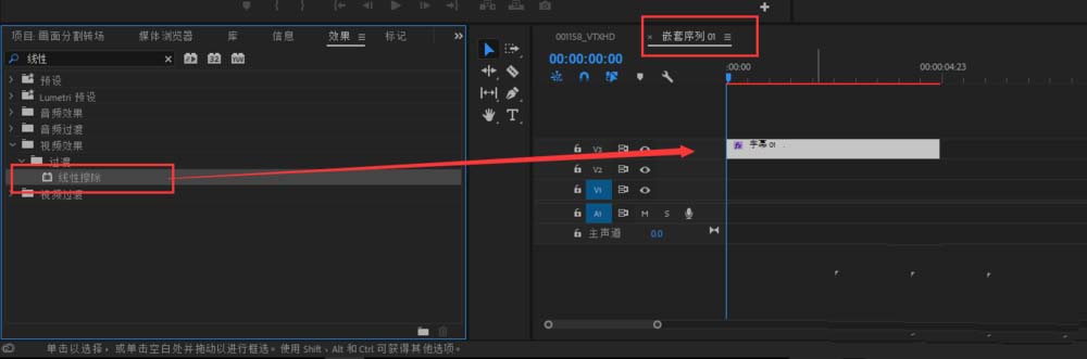6、双击字幕进入嵌套编辑序列,打开效果窗口,搜索关键字“线性”,在出现的效果中选择线性擦除,并将该效果添加到字幕上。