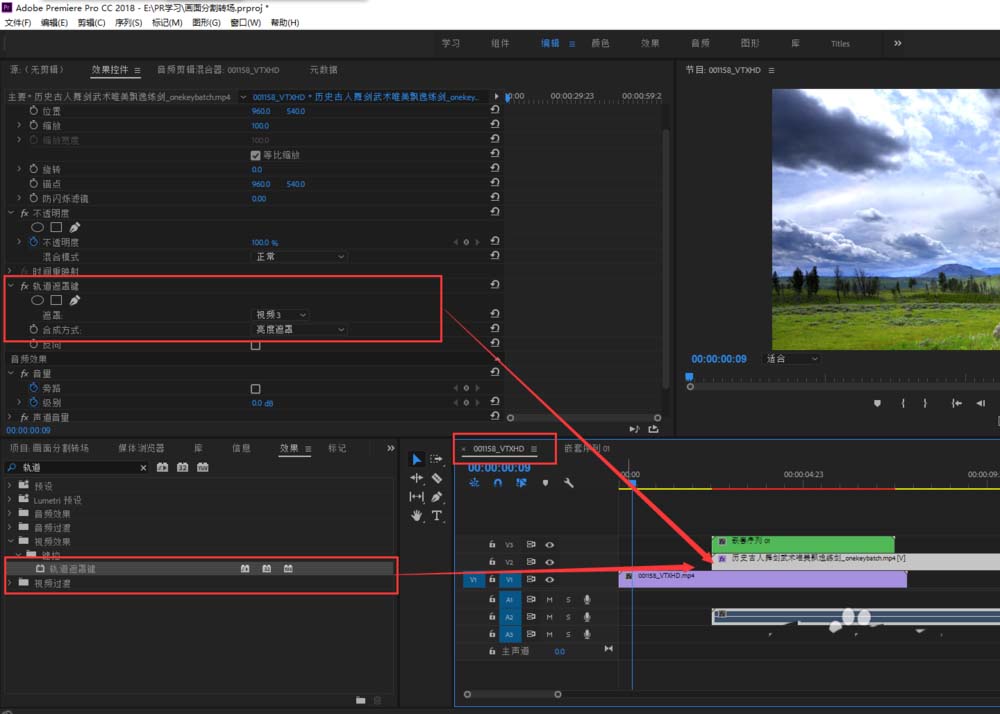 9、返回到一开始的序列中,在效果窗口中搜索“轨道遮罩键”效果,将该效果应用到轨道2视频中,打开效果控件窗口,在轨道遮罩键效果设置中选择遮罩方式为视频3,合成方式为亮度遮罩。
