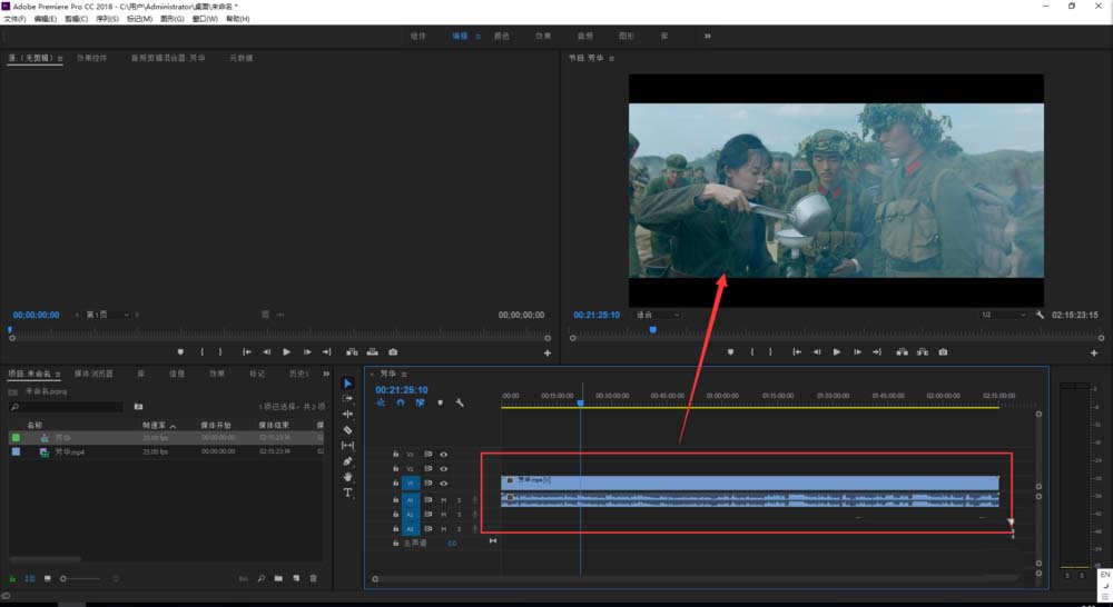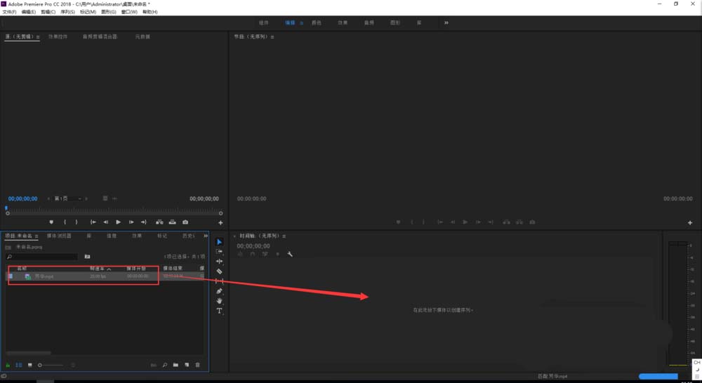 4、鼠标选中导入的视频,不送手,直接把视频拖拽到时间轴模块中,就会自动新建一个序列。