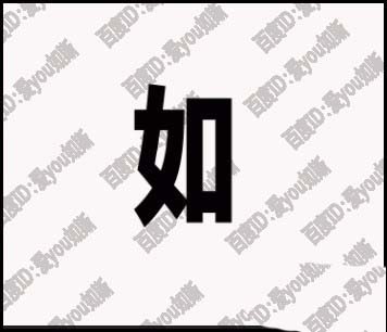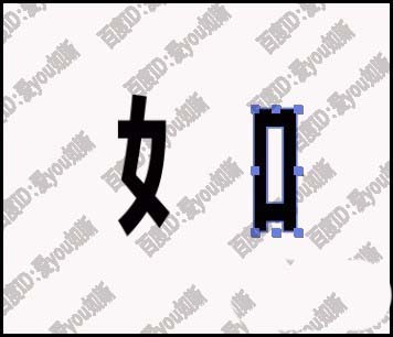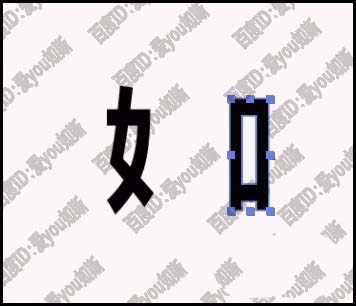 7、再把第三个如删除掉,再看窗口中的口,已被完全删除掉了。接着,同样方法,再把如字图层创建形状,得到一个如轮廓,再如上述方法,把女这边删除掉。那么,现在女和口已是分开。成为独立的文字啦。