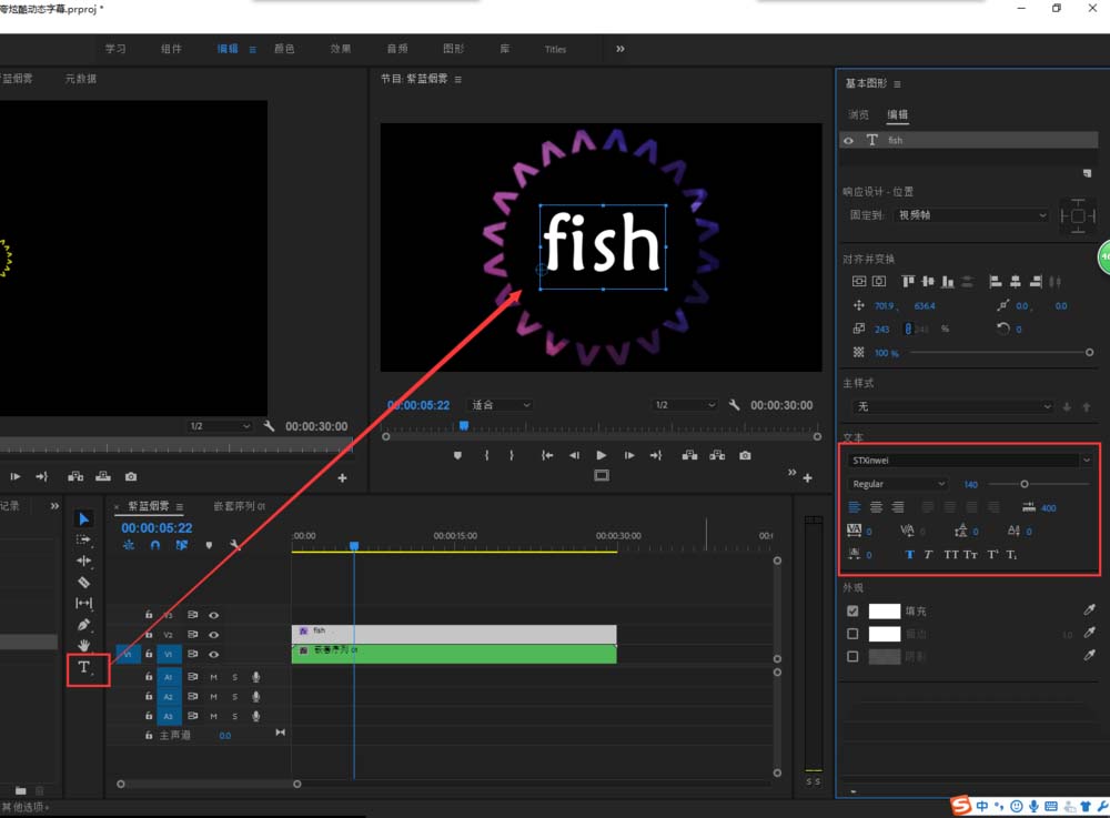 7、在嵌套的序列中选择文字工具,在视频中输入文字“fish”,打开图形窗口,设置字体字号等属性。