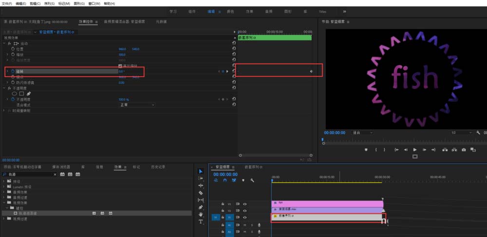 9、在选中嵌套的轨道1,在第一帧位置打入一个关键帧,设置旋转为0,在最后在打入一个关键帧,设置旋转角度为一个较大的数值(大家根据效果去调)。设置完成之后,点击播放,一个浮夸炫酷的动态字幕效果就制作完成了。