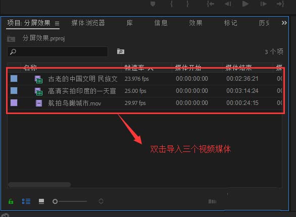 2、在打开的PR软件界面中找到项目管理窗口,在项目管理窗口空白处双击鼠标左键,弹出媒体导入窗口,选择三个视频媒体进行导入。