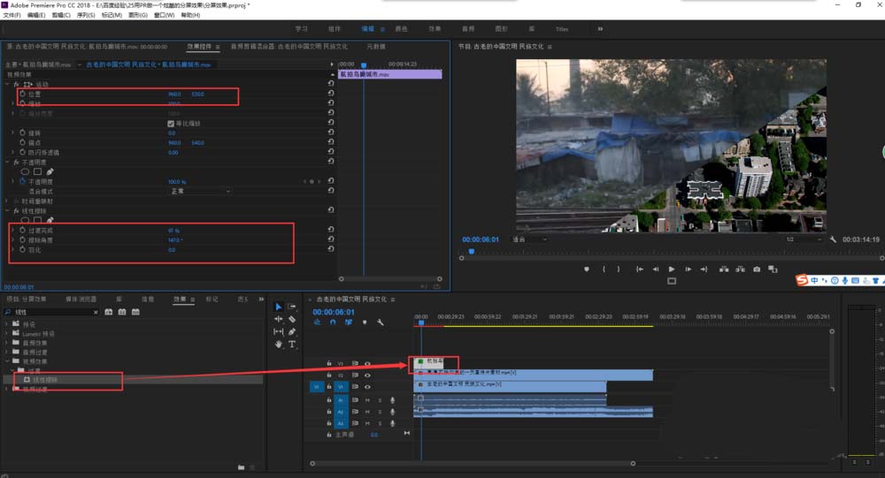 4、选中最上面轨道3中的视频,打开效果窗口,搜索“线性擦除”效果,选中该效果拖动施加到轨道3的视频中,然后在效果控件窗口中进行相应的效果设置,首先调整线性擦除效果中过渡完成与擦除角度的数值,在适当调整位置,这个数值不是死的,只要调整到你觉得合适就可以了。