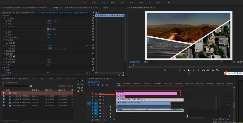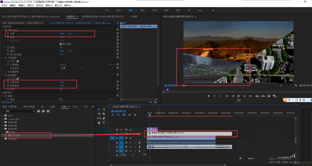 5、同理,在选中轨道2中的视频,将线性擦除效果也施加给轨道2视频,同样的在效果控件中调整线性擦除效果的过渡完成与擦除角度的数值。调整到合适即可。