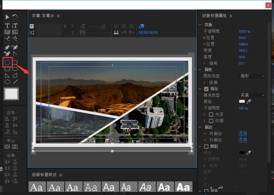 7、在打开的字幕编辑窗口中,找到工具栏中的矩形工具,绘制出两条宽度合适的矩形,然后将其进行旋转,移动到分屏视频的分割线出;在用矩形工具在视频边框四周画出矩形长条。使其更好看。编辑好之后就可以退出字幕窗口。
