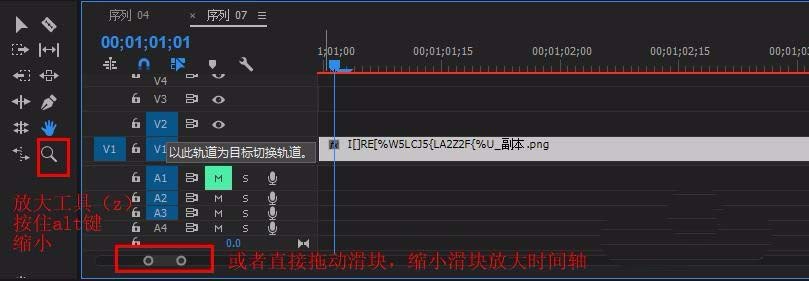 3、将时间轴放大,放大(这个方便设置后面弹出速度不会变得太慢),选择“放大工具(c)”在画面中点击即可,(按住alt键点击放大工具,是缩小)