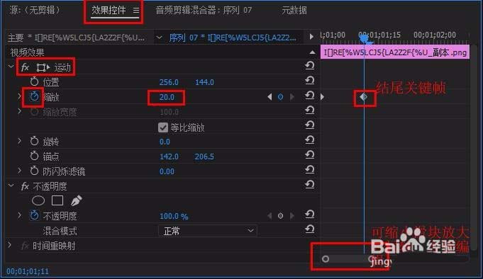 4、将时间标尺放到图片开始处,在“效果控件”面板找到“运动”-“缩放”,打开前面的动画图标,建立开始关键帧,设置数值为 0