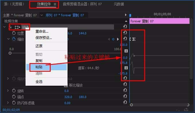 7、文字弹跳与这一致,直接将图片替换为文字即可,也可以快速复制效果,选中制作好的图片,在“效果面板”-“运动”右击选择“复制”,将文字拖到视频轨道上,时间标尺移至文字开始处,在文字“效果面板”-“运动”右击鼠标选择“粘贴” 即可