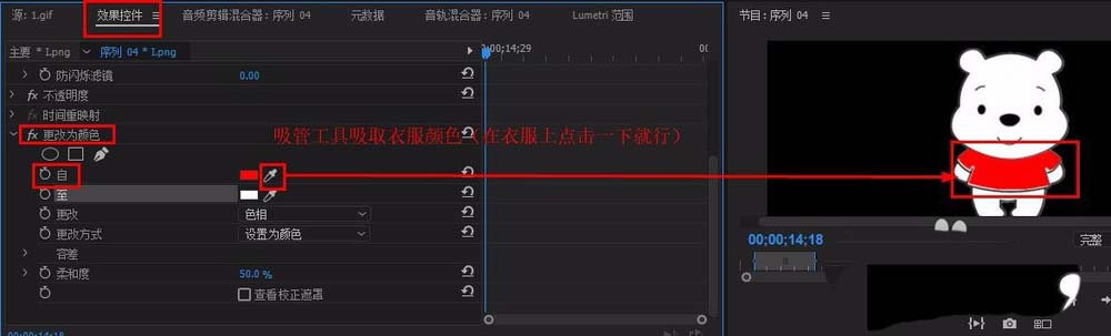 4、选中v2衣服素材,在“效果控件”面板中找到“更为改颜色”,(“视频效果”-“颜色更正”-“更改为颜色”),修改“自” 红色(点击吸管图标,再点击衣服,吸取红色衣服颜色),“至” 蓝色(点击矩形颜色块,选择想要的颜色,确定),此时衣服的颜色就已经更改了