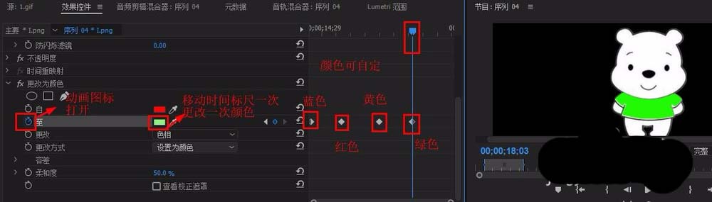 5、若想做出不停变换颜色的效果,可以为“至”打上关键帧,即 时间标尺放在素材开始处,打开“至”前面的动画图标,点击颜色块修改颜色,时间标尺向后移动数帧(自定),再次更改颜色,重复操作完成衣服变色效果