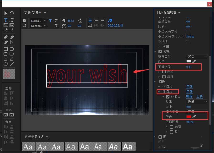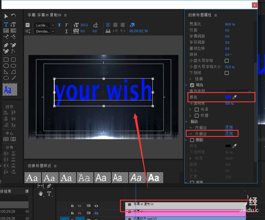 6、双击复制的字幕,进入字幕编辑,将填充颜色不透明度改为100%,设置一个填充颜色,再将描边删除。