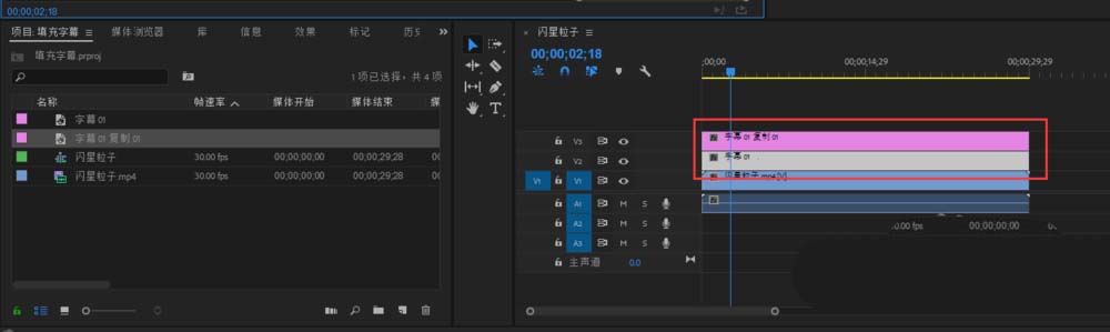 5、退出字幕编辑窗口,在字幕拖到视频轨道2中,然后按住键盘上的辅助键alt键,将字幕复制一份放到视频轨道3上。