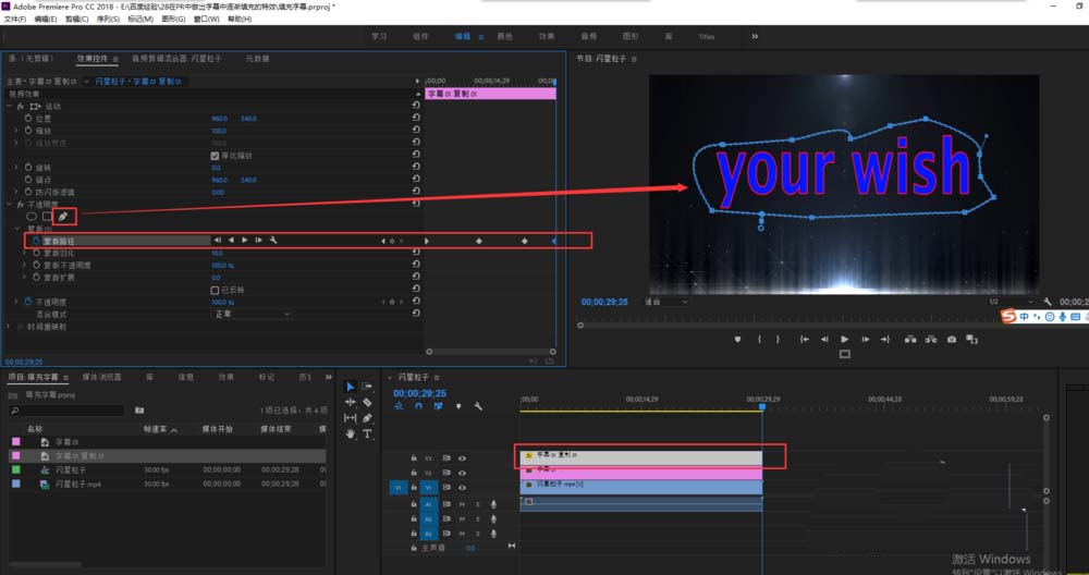 7、选择复制的字幕,打开效果控件,在效果控件中,找到不透明度的钢笔工具,绘制一个蒙版,在第一帧的位置,将绘制区域一点都不包含字幕,创建一个关键帧;然后移动时间轴位置,在创建一个关键帧,调整绘制的蒙版,让蒙版区域包含字幕的一部分;以此类推,创建多个关键帧,一直到最后一帧,调整钢笔绘制的蒙版将字幕全部包含(这里我创建了四个关键帧)