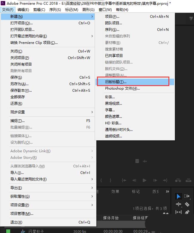 2、选择文件菜单,新建中的旧版标题,弹出字幕创建窗口,点击确定创建字幕。