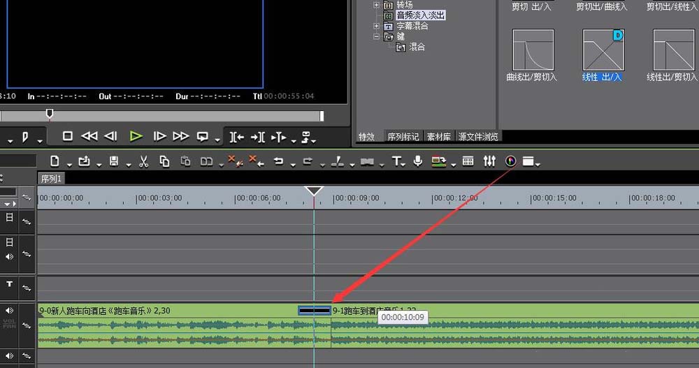 4、在音频滤镜里面找到-线性出入-拖动到音频交界处