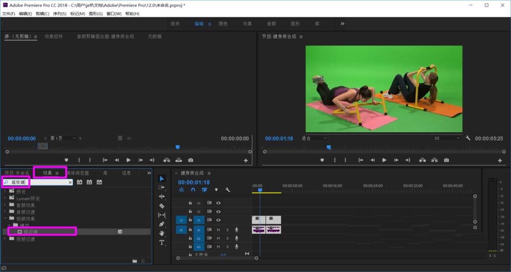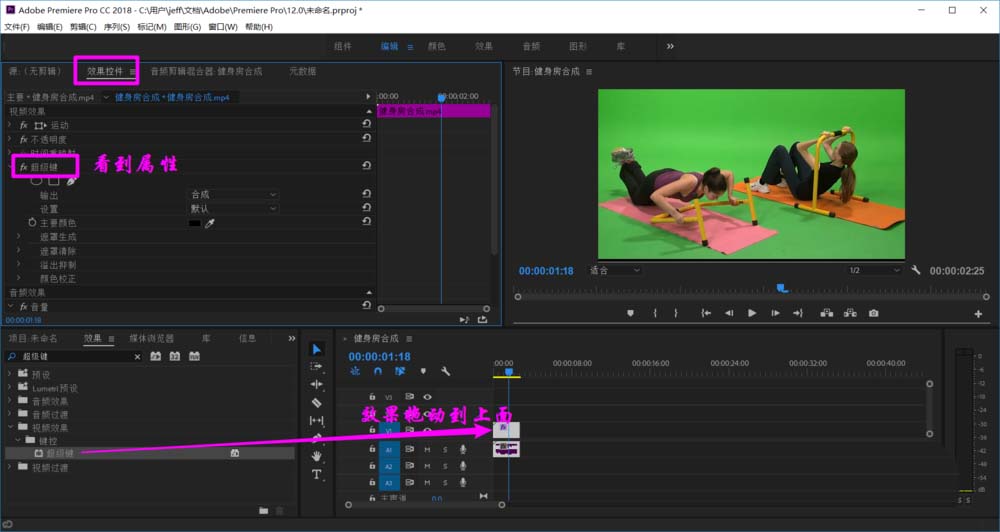 4、将超级键效果拖动到视频上,在源面板上的 效果控件 项下可以看到添加效果成功