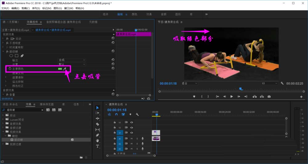 5、找到超级键下的 主要颜色项,点击吸管图标。再到节目面板吸取颜色,这里就是绿色了,吸取之后看到的效果