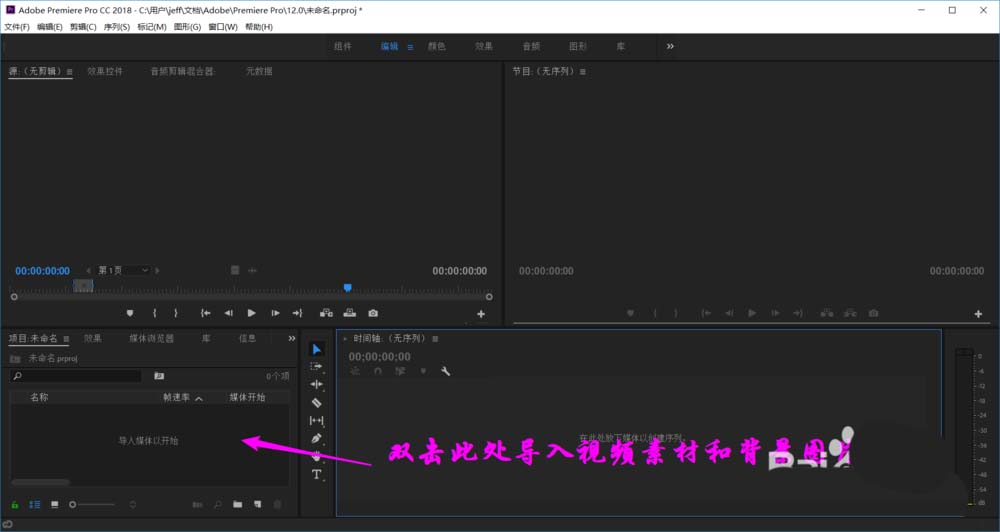 1、首先,打开电脑上的软件,新建项目进入页面,双击项目面板导入视频素材以及背景图片素材