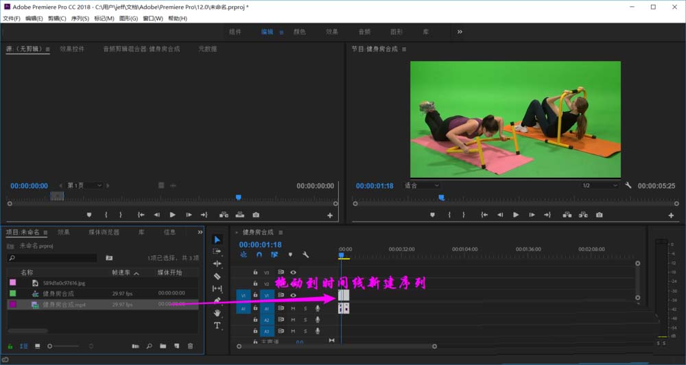 2、将绿幕视频素材拖动到时间轨道上,以视频新建序列