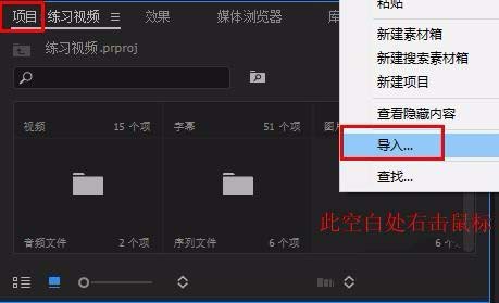 1、打开pr,在“项目”面板空白处右击鼠标选择“导入”,导入视频