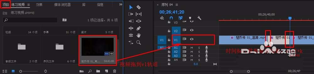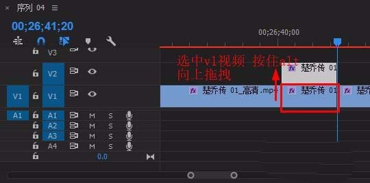 3、选中视频片段,按住alt键向上拖拽,复制视频到v2轨道
