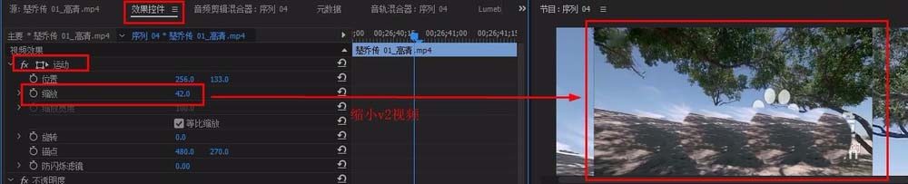 4、选中v2视频,在“效果控件”面板找到“运动”-“缩放”,将视频缩小的合适位置(如图)