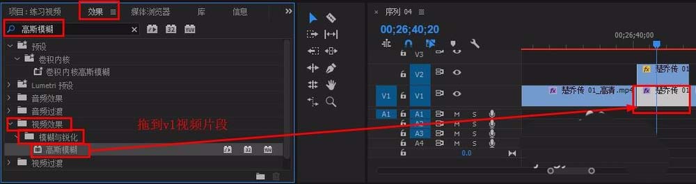 5、在“效果”面板搜索栏输入“高斯模糊”,将其拖到v1视频片段上
