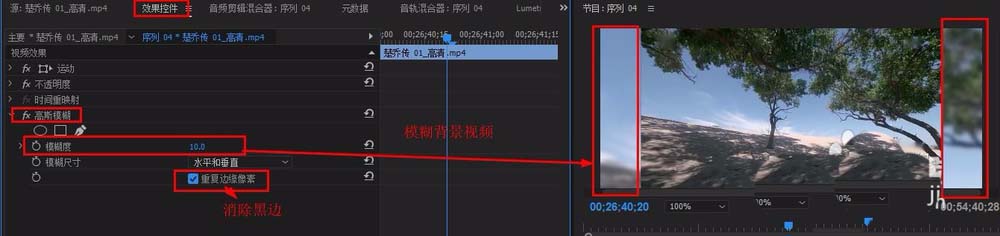 6、选中v1视频片段,在“效果控件”面板找到“高斯模糊”,修改“模糊度”为 10(可自定),勾选“重复边缘像素”(消除黑边),完成